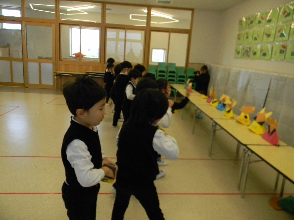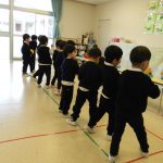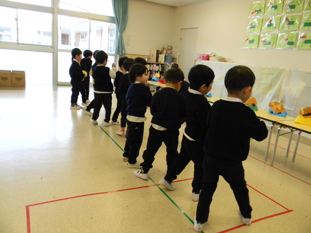豆まきをしました(年中) 今日は豆まきをしました。 「おにはそと!ふくはうち!」と元気な声が響き、それぞれ心の中の鬼を思い浮かべながら豆を投げました。 少しドキドキしつつも、最後は笑顔いっぱい。 福を呼び込む、楽しい豆まきになりました。